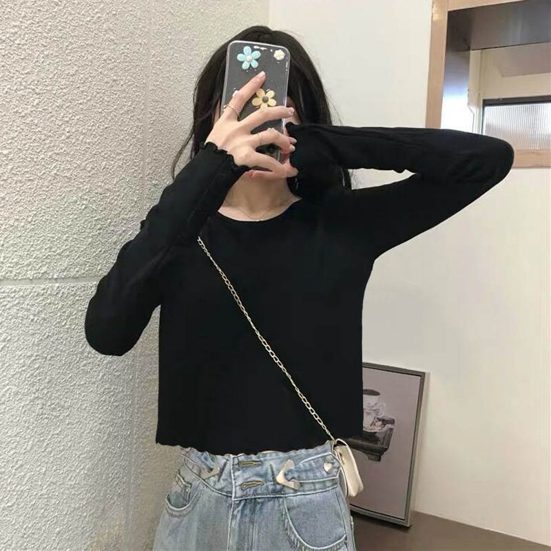 木耳邊韓版修身高彈長袖上衣【買一送一】黑色兩件(到手2件!每件均價400元!)