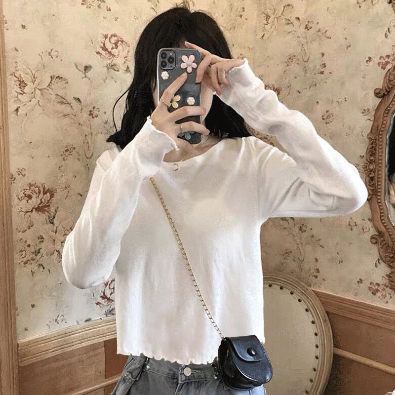 木耳邊韓版修身高彈長袖上衣【買一送一】白色兩件(到手2件!每件均價400元!)