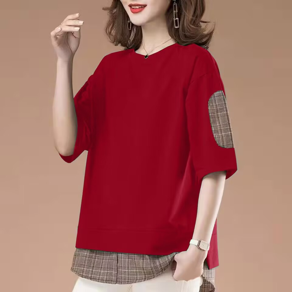 休閒寬鬆設計感假兩件T恤【買一送一】【咖色】+【紅色】各一件(到手兩件,每件均價549元)