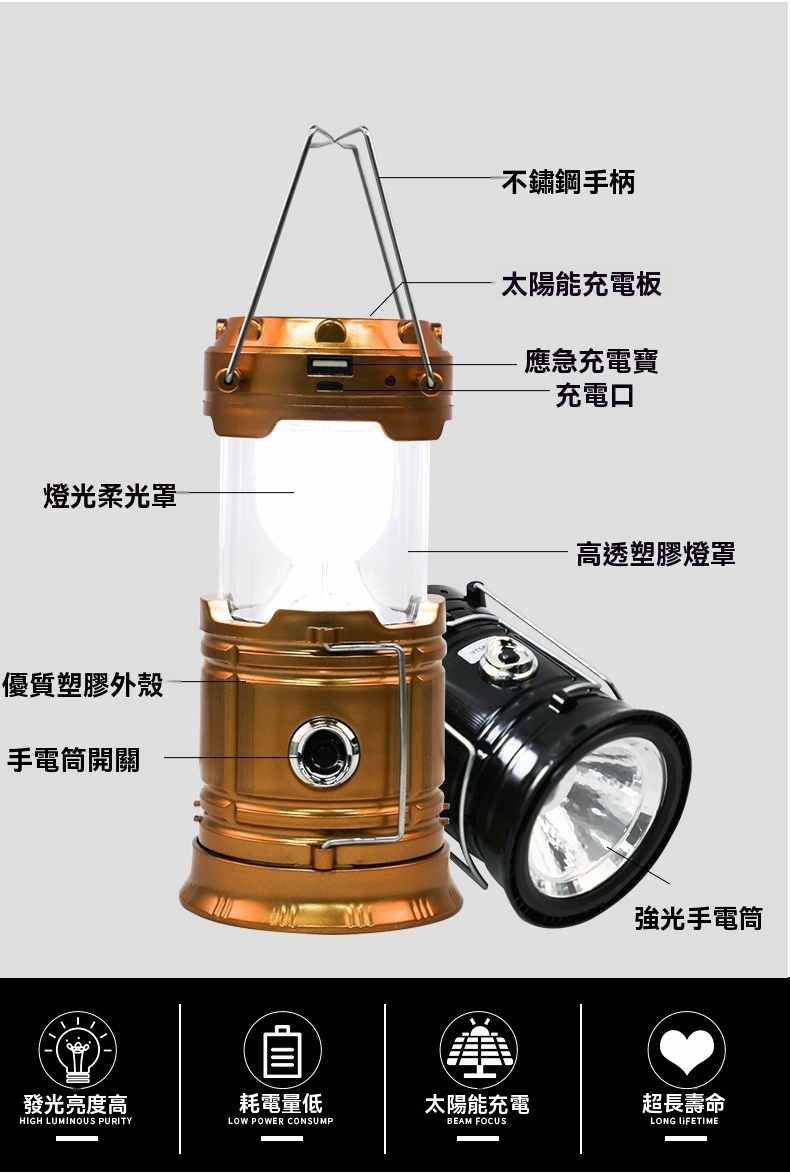 太陽能多功能戶外便攜式露營燈【買一送一】金色+藍色各一組(到手2組,每組均價399元!)