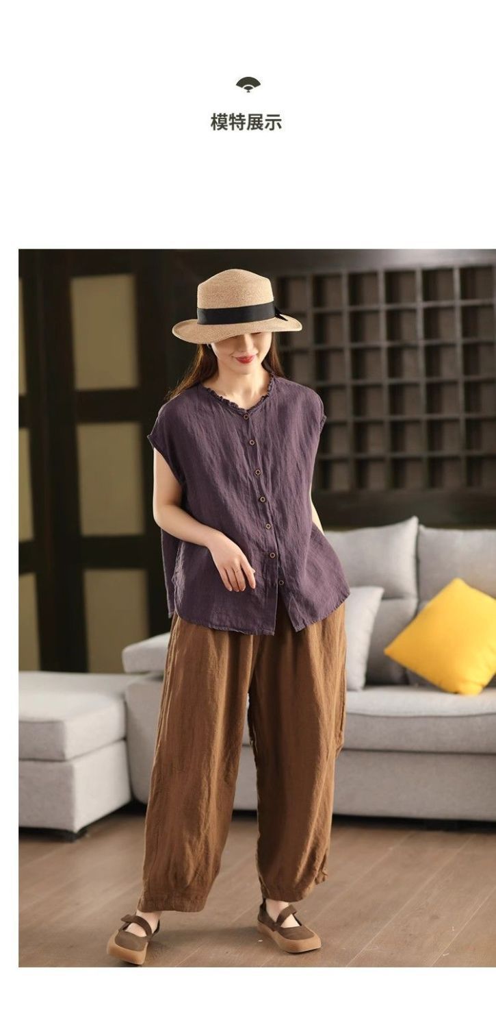 涼快寬鬆花邊領紐扣棉麻上衣【煙紫色】+【麻本色】各一件(到手兩件,每件均價549元)