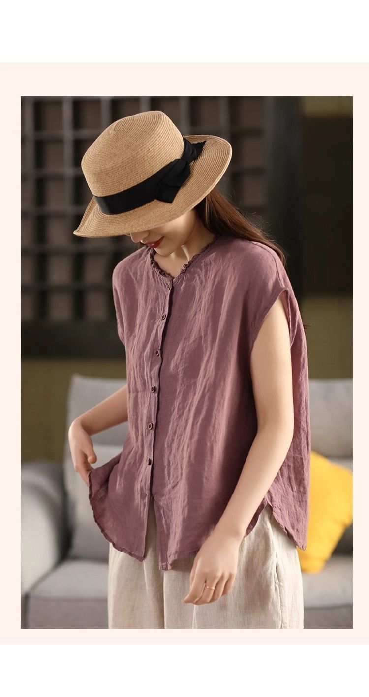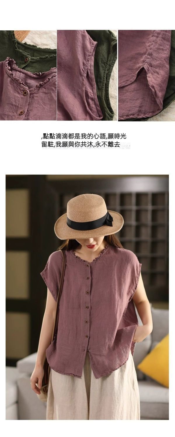 涼快寬鬆花邊領紐扣棉麻上衣【煙紫色】+【玫紅色】各一件(到手兩件,每件均價549元)
