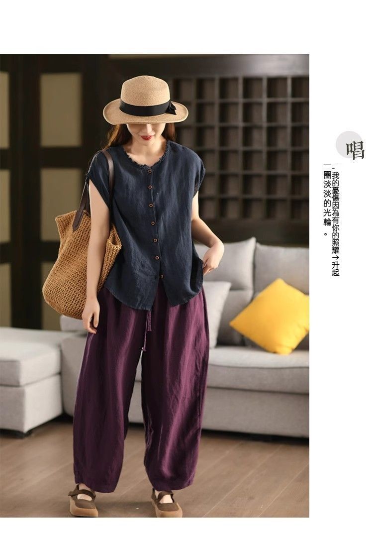 涼快寬鬆花邊領紐扣棉麻上衣【煙紫色】+【藏青色】各一件(到手兩件,每件均價549元)