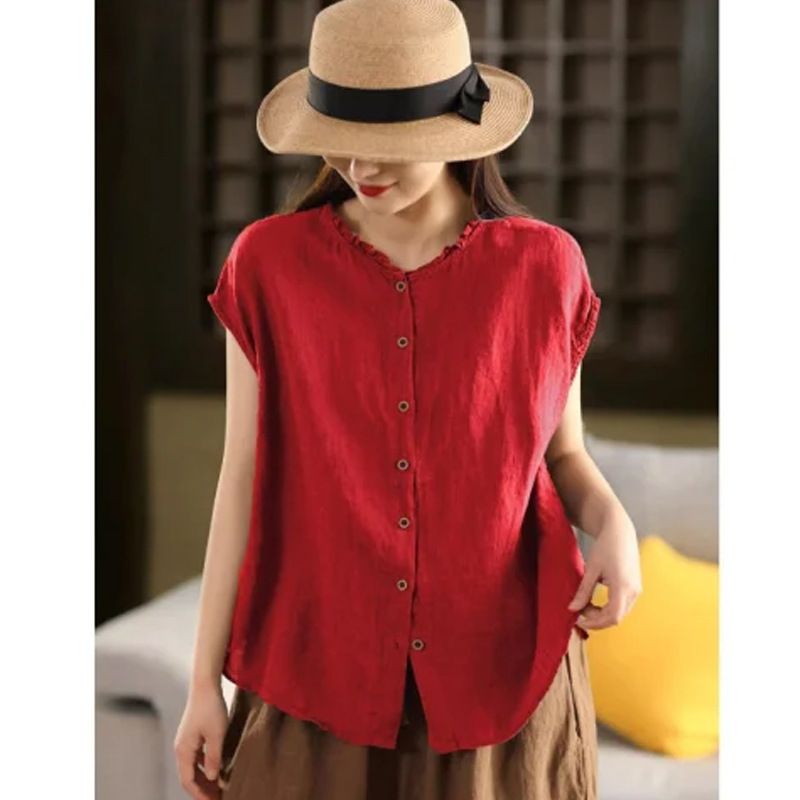 涼快寬鬆花邊領紐扣棉麻上衣【大紅色】+【麻本色】各一件(到手兩件,每件均價549元)