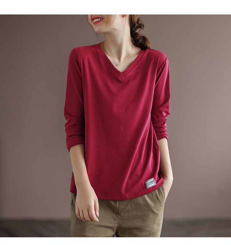 V領百搭女士純色長袖上衣【買一送二】【紅色】+【白色】+【藍色】各一件(到手3件,每件均價333元!)