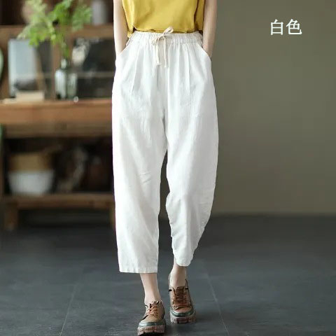 棉麻復古寬鬆純色百搭休閒九分褲【買一送一】【白色】+【藏藍色】各一件(到手兩條,每條均價549元)