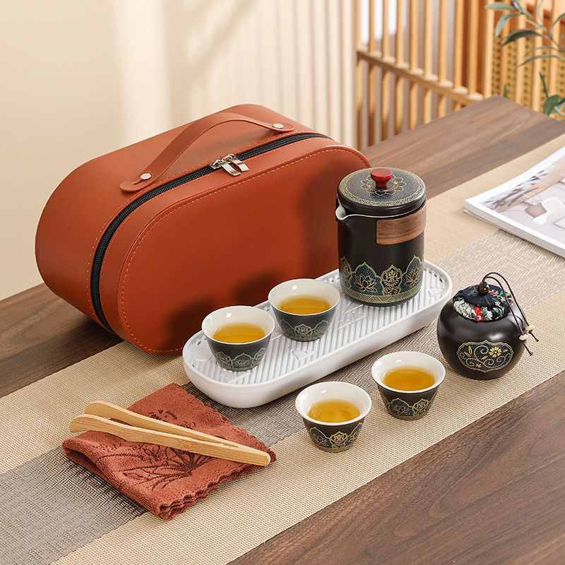 陶瓷套裝【雅黑】一壺四杯+罐巾夾+橢圓包+盤一組