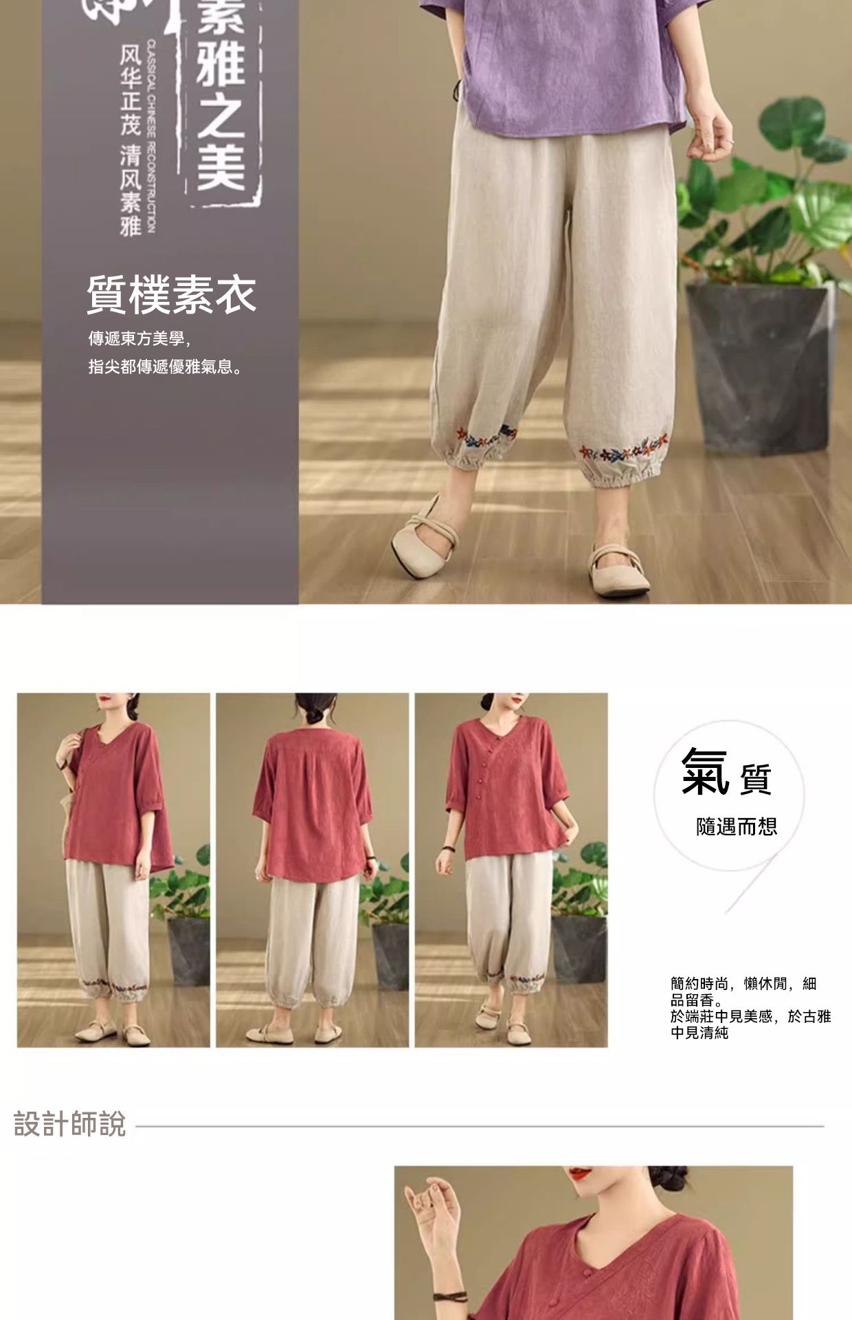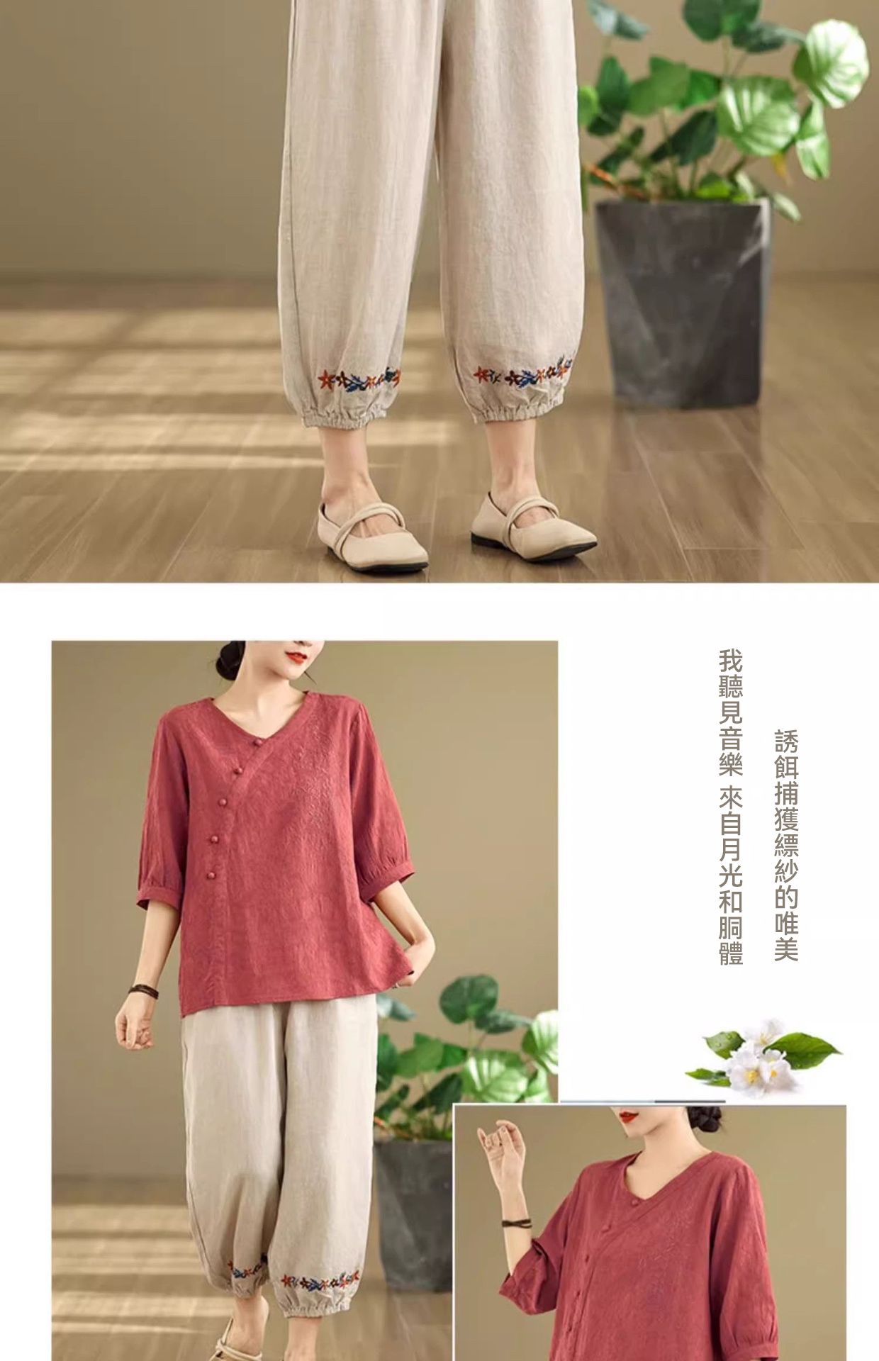 新中式媽媽棉麻刺繡上衣【買一送一】【紅色】+【紫色】各一件(到手兩件,每件均價649元)