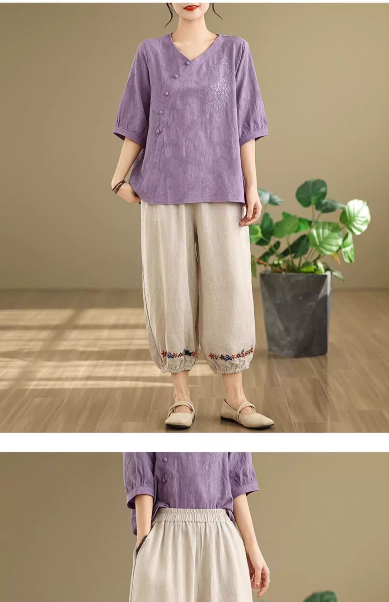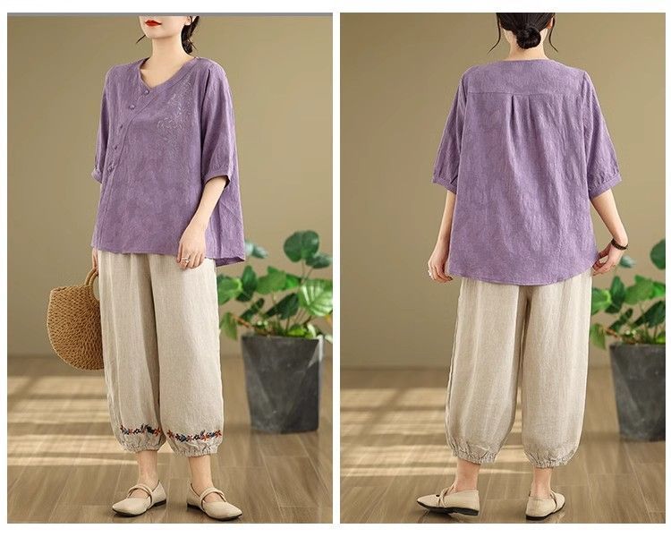 新中式媽媽棉麻刺繡上衣【買一送一】【藍色】+【紫色】各一件(到手兩件,每件均價649元)